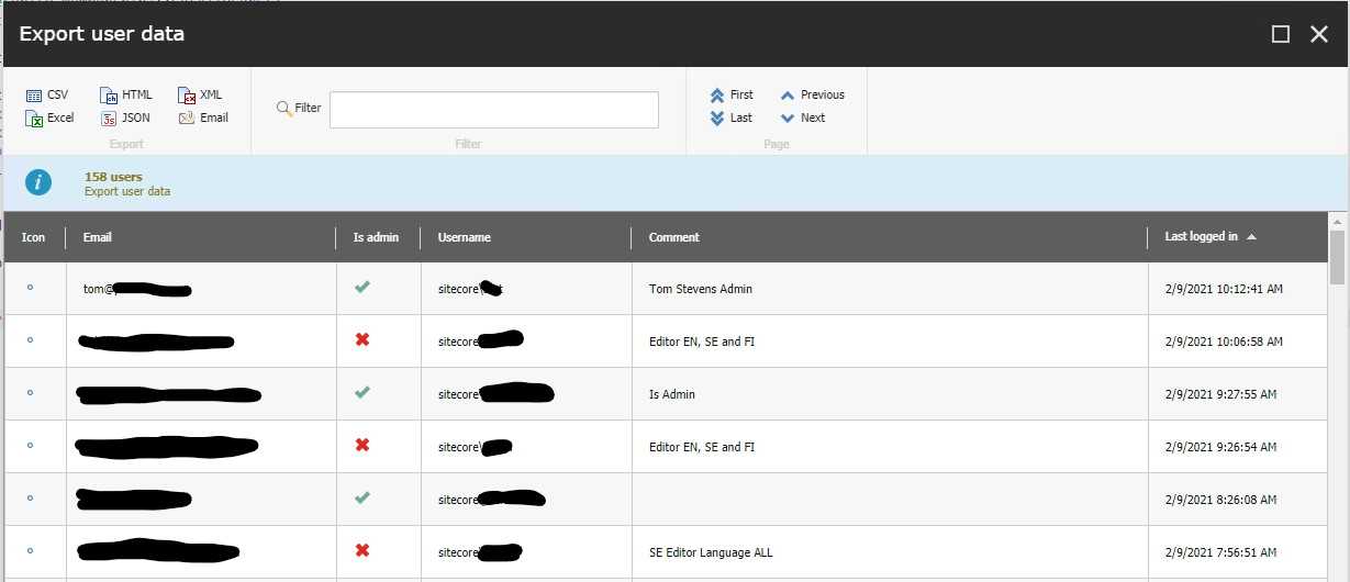 $users | Show-ListView @propsIt renders as listview in Sitecore Powershell, in this the records can be sorted by the different columns and then exported to a variety of formats.